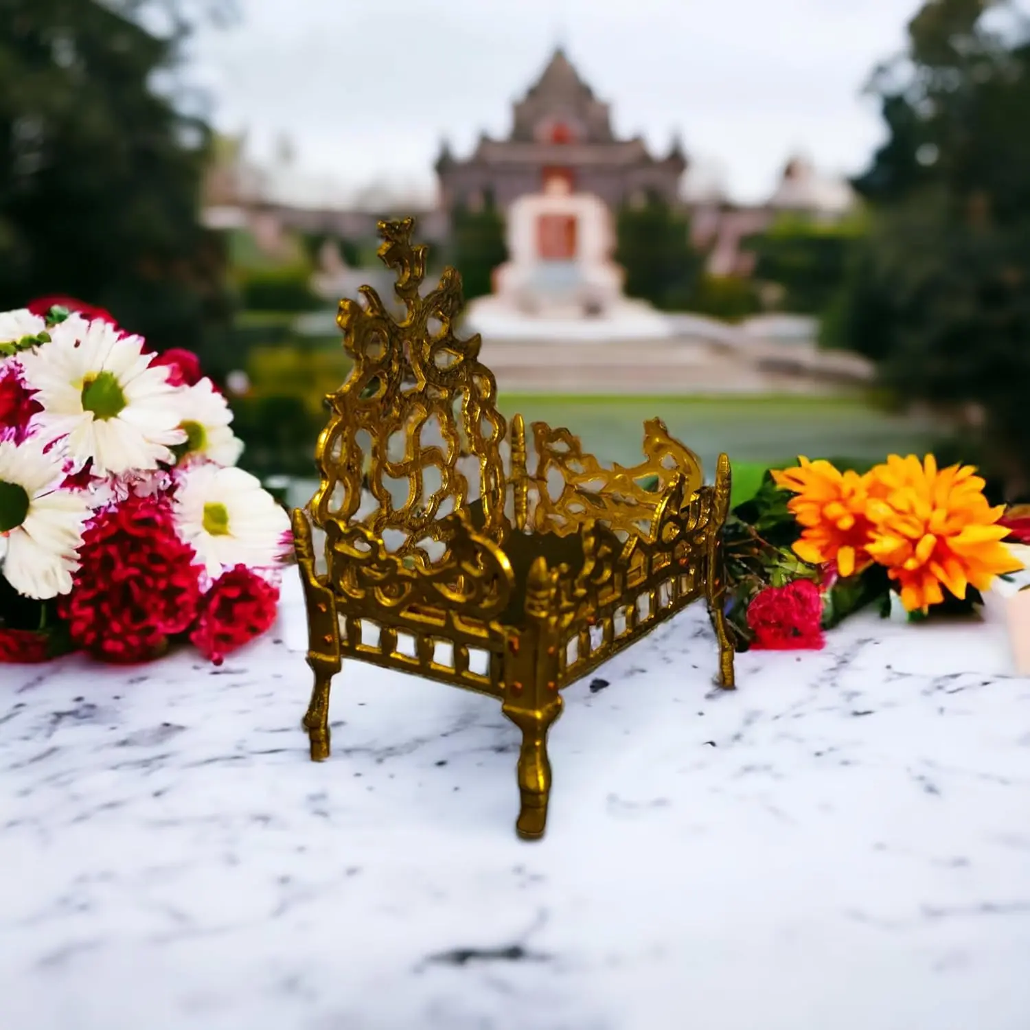 Its elevated design and ornate craftsmanship are ideal for placing idols of Lord Krishna, Ganesha, Lakshmi, Durga, or any deity, during daily prayers, festivals, or special rituals. The gleaming gold-toned finish adds a sacred elegance to your home altar or pooja room.