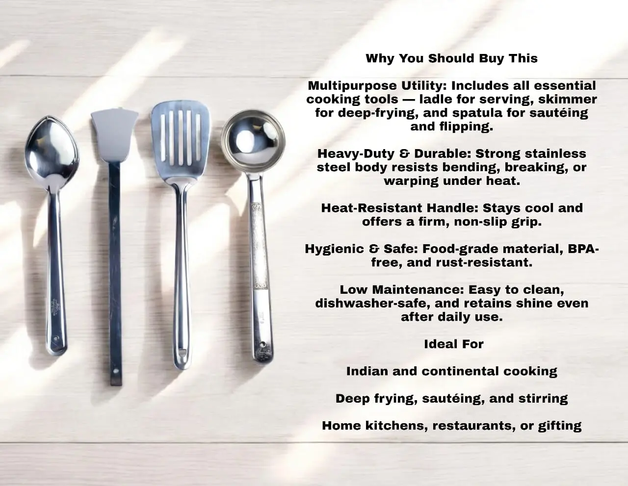 Upgrade your kitchen essentials with this Stainless Steel Cooking Spoon Set, including a ladle, skimmer, and spatula—designed for versatile everyday cooking. Crafted from premium-grade stainless steel, each utensil is built to handle high heat, resist rust, and offer long-term durability. The ergonomic handles ensure a comfortable grip, while the seamless design prevents food buildup and makes cleaning effortless. Whether you’re stirring curry, skimming oil, or flipping parathas, this set delivers performance, style, and strength in one package.