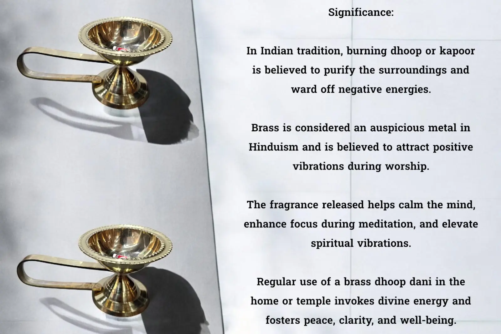 Dhoop danis and kapoor danis have been part of Indian spiritual culture for centuries. Used in temples and homes alike, they are rooted in Vedic traditions that emphasize the importance of scent and fire in ritual purification. Brass, being a sacred and long-lasting metal, has traditionally been used to craft these vessels. They were often passed down through generations as part of a family’s spiritual heritage.